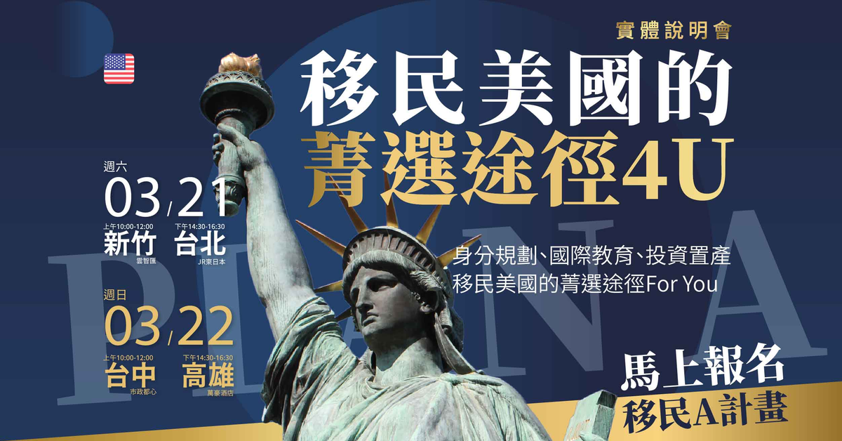 掌握移民 A 計畫,解析美國菁選移民途徑與地緣政治下的備案策略,高雄、新竹、台北、台中巡迴舉辦,立即預約席次。移民美國A計畫3月21日週六新竹、台北,22日週日台中、高雄掌握移民 A 計畫,解析美國菁選移民途徑與地緣政治下的備案策略,高雄、新竹、台北、台中巡迴舉辦,立即預約席次。移民美國A計畫3月21日週六新竹、台北,22日週日台中、高雄掌握移民 A 計畫,解析美國菁選移民途徑與地緣政治下的備案策略,高雄、新竹、台北、台中巡迴舉辦,立即預約席次。移民美國A計畫3月21日週六新竹、台北,22日週日台中、高雄